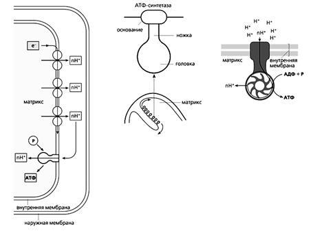 Фермент АТФ-синтетаза, катализирующий образование АТФ из АДФ и неорганического фосфата, представляет собой встроенное во внутреннюю мембрану грибовидное тельце с каналом в центре. Когда ион Н+ прорывается по этому каналу в матрикс, энергия протонного тока идет на синтез АТФ. Других путей возвращения в матрикс у протона нет, поскольку в нормальном состоянии внутренняя мембрана непроницаема для ионов. Процесс синтеза АТФ за счет энергии переноса электронов называется окислительным фосфорилированием.