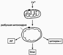 Под действием избытка ионов кальция митохондрия разбухает, через пору из нее выходит цитохром с и два белка - AIF и Smac. Первый белок индуцирует апоптоз, а второй активирует некоторые прокаспазы.