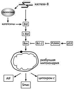 В запуске апоптоза, вызванного повреждениями ДНК, активацией онкогенов и гипоксией, принимает участие белок-53 (р53), взаимодействуя с Вах, стимулируя “рецепторы смерти” и апоптозные гены. р53 активирует модулятор суицида PUMA (p53 upregulated modulator of APOptosis), который затем связывает Bcl-2 и выводит из строя этот препятствующий апоптозу белок. Тем самым выход цитохрома с из митохондрий уже ничем не сдерживается.