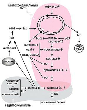 Органеллы, обеспечивающие жизнедеятельность клетки, обеспечивают и ее смерть. При сильном стрессовом воздействии (переохлаждении; нагревании; стимуляции образования АФК другими структурами клетки, помимо митохондрий; перекисном окислении липидов плазматической мембраны - чаще всего при облучении) в цитоплазме резко повышается концентрация ионов кальция. Если кальциевые депо клетки не справляются с его утилизацией, открывается так называемая митохондриальная пора диаметром 2.6-2.9 нм. Она представляет собой канал, проходящий через обе митохондриальные мембраны и состоящий из трех белков: транслокатора адениновых нуклеотидов, потенциалзависимого анионного канала (порина) и бензодиазепинового рецептора. Когда этот комплекс связывается с Са2+, через мембранную пору могут проходить вещества с небольшой молекулярной массой. Это приводит к падению мембранного потенциала и набуханию матрикса, целостность внешней мембраны неизбежно нарушается, и из межмембранного пространства в цитоплазму выходят белки апоптоза. Их несколько: фактор, индуцирующий апоптоз (APOptosis-inducing factor - AIF), вторичный митохондриальный активатор каспаз (second mitochondria-derived activator of caspases - Smac) и некоторые прокаспазы. Индуцирующий фактор направляется прямо в ядро, где вызывает деградацию ДНК.