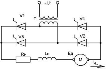 Рассмотрим силовую часть управляемого выпрямителя со средней точкой при работе на последовательно включенные активно-индуктивную и противо-ЭДС двигателя М нагрузки: