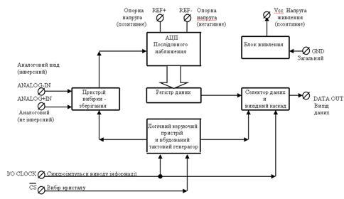 На рис.11 приведена структурна схема стандартних послідовних АЦП. виконаних в корпусах з вісьма виводами. Логічний контролер з вбудованим тактовим генератором управляє роботою схеми перетворення функціонуючої за принципом послідовного наближення. Цей принцип полягає в поступовому покроковому накопиченні в проміжному регістрі даних двійкового кодового слова, відповідного співвідношенню вхідної аналогової напруги (різниці між рівнями напруги на диференціальних входах АNALOG +IN і ANALOG-IN) і опорної напруги (різниці між рівнями напруги на диференціальних входах REF+ і REF-).