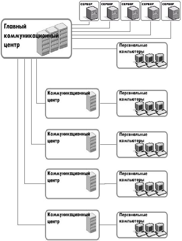 WWW сервис | Сервис эл. почты, клиентов | Сервис базы данных, клиентов | Файловый сервис и сервис печати, клиентов | Терминальный сервис, клиентов | Backup сервис | | Сервер №1 | Да | - | - | - | - | Да | | Сервер №2 | - | 650 | - | - | - | - | | Сервер №3 | - | - | 60 | - | - | - | | Сервер №4 | - | - | - | 650 | - | - | | Сервер №5 | - | - | - | - | 30 | - | Распределение рабочих станций здания | Главный коммуникационный центр | 5 | шт | | Коммуникационный центр №1 | 130 | шт | | Коммуникационный центр №2 | 130 | шт | | Коммуникационный центр №3 | 130 | шт | | Коммуникационный центр №4 | 130 | шт | | Коммуникационный центр №5 | 130 | шт | по коммуникационным центрам