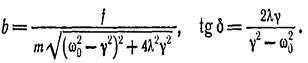 , δ стремится к нулю, а со стороны γ > ω0 — к значению — π. Изменение δ от нуля до — π происходит в узкой (ширины ~ λ) области частот, близких к ω0; через значение -π/2 разность фаз проходит при γ =
