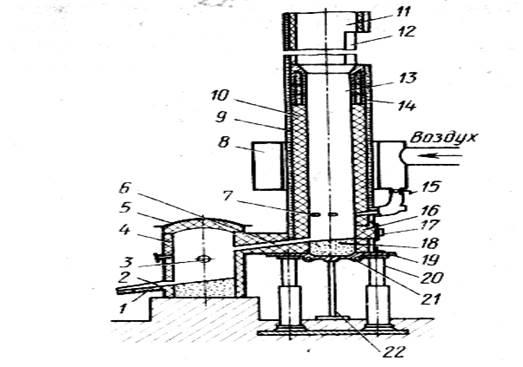 Вагранка представляет собой плавильную печь шахтного типа. На рис.1 изображена вагранка со стационарным копильником. Вертикальный цилиндрический кожух 9