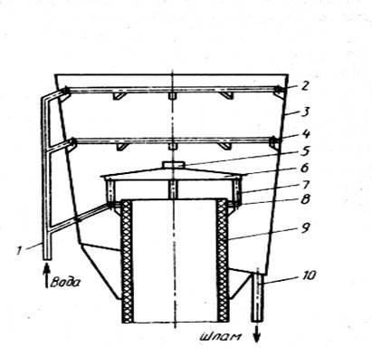 на конце зонта. Во время работы вагранки по зонту (по всей окружности) стекает поток воды, через который проходят ваграночные газы. Все крупные и средние частицы пыли отделяются потоком воды от газов и увлекаются вниз к сливной трубе 10