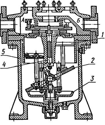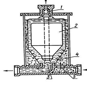 Схема центробежного фильтра-газоотделителя показана на рис. 10. Поток бензина подается в газоотделитель через радиальный трубопровод 2 по касательной к установленной в камере газоотделителя конусной перегородке. Вследствие этого столб бензина в камере приобретает винтообразное движение. Под действием центробежной силы более тяжелые частицы жидкости как бы отбрасываются к стенкам камеры, а легкие пузырьки воздуха группируется в центре и через отверстие в перегородке поступают к клапану 4. Этот клапан регулирует выходное отверстие для сброса воздуха в отводной трубопровод 1 в зависимости от давления