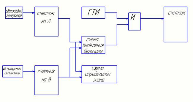 Сигналы с образцового и испытуемого генераторов поступают на счетчик с модулем счета 8. По окончании восьмого импульса один из выходов счетчика устанавливается в единицу. Но при неравенстве частот единицы на выходе этих счетчиков установятся в разное время.