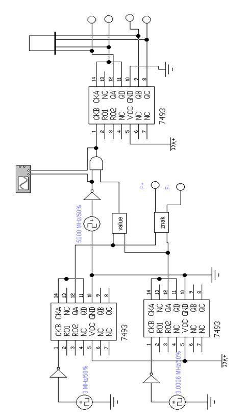 Если частоты образцовой и испытуемой последовательностей отличаются, их периоды будут соответственно тоже отличаться, таким образом, единицы на выходе счетчика установятся в разное время. Следовательно, следует ввести схему, выделяющую этот временной промежуток. Далее нам необходимо «оценить» этот промежуток, для этого мы заполним его импульсами и сосчитаем количество импульсов. Количество импульсов будет означать степень разности частот.