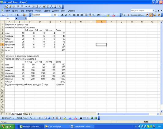Sheets("Результат").Cells(22, 1) = "Вид цветов принесший макс доход за 2 года"