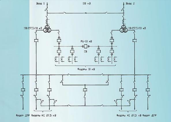 Рис. 3 Общий вид электрифицированной железной дороги постоянного тока и питающих её устройств