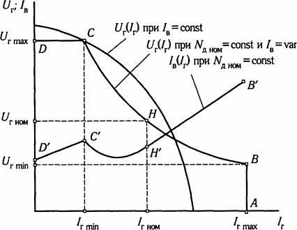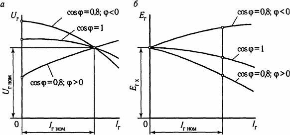 На рис. 1 показаны внешние естественные характеристики трехфазного синхронного генератора, иллюстрирующие зависимость напряжения U г на его зажимах от тока обмотки статора Ir при заданном коэффициенте мощности приемников соs φ = const, неизменном токе возбуждения в обмотке ротора IB = const и постоянной частоте вращения ротора, чему отвечает неизменная частота переменного тока f=const. Эти характеристики могут исходить как из общей точки (0, Егx