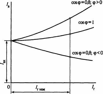Основной естественной внешней характеристикой синхронного генератора считают кривую Uг (Iг), полученную при симметричном режиме, коэффициенте мощности приемников cos φ = 0,8 и φ > 0.