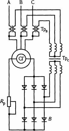 , но и автоматически, что особенно удобно при синхронных генераторах с самовозбуждением (рис. 1.3). Здесь при холостом ходе генератора вторичные обмотки вольтодобавочного трансформатора Трв играют роль дросселей, снижающих напряжение на зажимах согласующего трансформатора Трс, через который питаются полупроводниковые диоды В. При увеличении нагрузки генератора в этих обмотках наводится ЭДС, в результате чего напряжение на диодах возрастает и увеличивается ток возбуждения генератора, что приводит к относительной стабилизации напряжения на его зажимах.