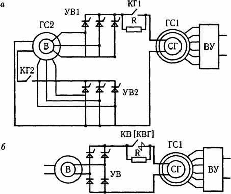Рис. 1.5. Принципиальные схемы независимого возбуждения синхронного тягового генератора: а - от синхронного возбудителя с самовозбуждением (тепловозы2ТЭ121, 2ТЭ116А, ТЭП75Л' б - от синхронного возбудителя через УВВ (тепловозы 2ТЭ116, ТЭП70, ТЭМ7)