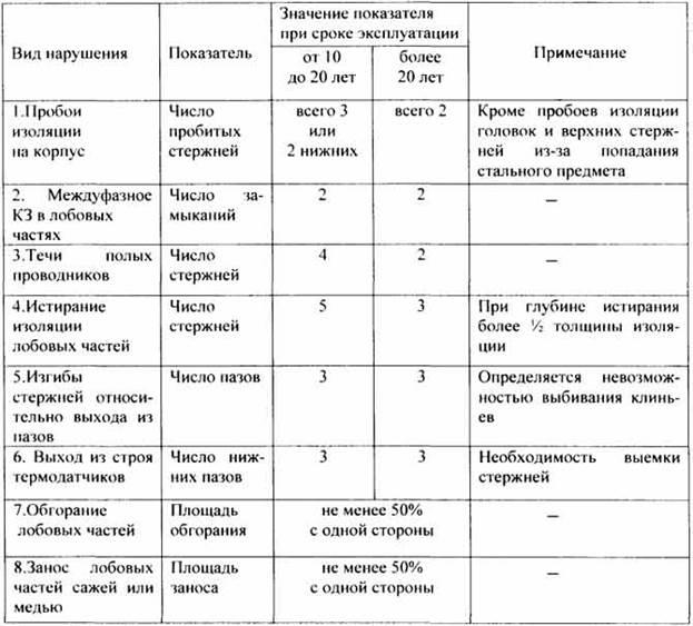 Показатели необходимости полной замены обмотки статора турбогенератора (с термореактивной изоляцией)