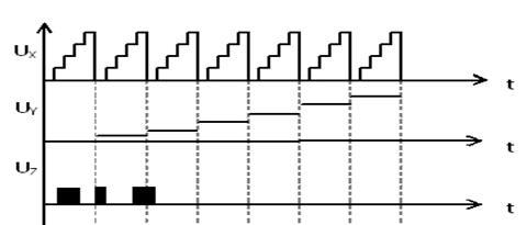 Приклад знаку, приклад часових діаграм напруг та структурна схема, необхідні для формування малоформатного точкового растру, наведені на рис.2. Лічильники Лn1