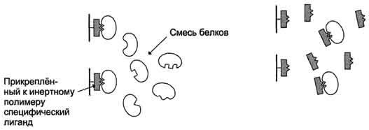 Это наиболее специфичный метод выделения индивидуальных белков, основанный на избирательном взаимодействии белков с лигандами, прикреплёнными (иммобилизированными) к твёрдому носителю. В качестве лиганда может быть использован субстрат или кофермент, если выделяют какой-либо фермент, антигены для выделения антител и т.д. Через колонку, заполненную иммобилизованным лигандом, пропускают раствор, содержащий смесь белков. К ли-ганду присоединяется только белок, специфично взаимодействующий с ним; все остальные белки выходят с элюатом. Белок, адсорбированный на колонке, можно снять, промыв её раствором с изменённым значением рН или изменённой ионной силой. В некоторых случаях используют раствор детергента, разрывающий гидрофобные связи между белком и лигандом.