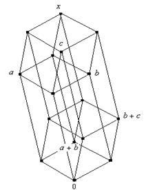 не содержит подрешёток, изоморфных ни диаманту, ни пентагону. Поэтому, по теореме 1.2., она дистрибутивна.