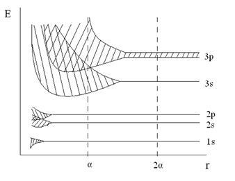 Рис. Расширение энергетических уровней при сближении атомов Na.