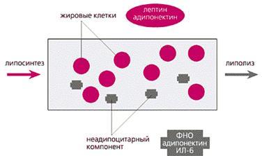 Если обобщить сведения о гормонах жировой ткани (в том числе и об упоминавшихся вскользь или вовсе не упоминавшихся), видно, что часть из них продуцируется преимущественно адипоцитами, а часть - “нежировым” компонентом адипозного органа [9]. Так, продукция лептина адипоцитами значимо превышает таковую для “нежирового матрикса”, секреция адипонектина теми и другими примерно одинакова, а продукция ФНО и ИЛ-6 в жировых клетках существенно (до 5-10 раз) слабее, чем в нежировых. Значит, степень гетерогенности жировой ткани (соотношения адипоцитов и неадипоцитов) далеко небезразлична для ее эндокринной функции.