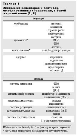 Представление о том, что жировая ткань, или адипозный орган, - не только энергетический резервуар или объект, интересующий модельеров и косметологов, а выполняет иные, причем весьма существенные функции, привело к быстрому развитию самостоятельного направления, адипобиологии. Хотя в 1989 г. Дж.Хирш и соавторы [8] задавались вопросом о том, отвечает ли жировая ткань только на потребности системы, регулируемой какими-то факторами вне ее, или же способна сама генерировать сигналы, воздействующие, например, на потребление и усвоение калорий, на самом деле подобного рода проблемы обсуждались значительно раньше. В частности, еще в 50-60-е годы прошлого века Дж.Кеннеди, Г.Хервей и ряд других исследователей считали, что информация идет не только “от гормона к телу”, но и “тело может быть источником гормона”. На примере белого жира можно увидеть, как эти два принципа уживаются друг с другом: в этой ткани имеются рецепторы значительного числа гормонов, и в то же время продуцируются пептидные гормоны - адипоцитокины или адипокины. Кроме того, в белой жировой ткани присутствуют также ферменты, участвующие в образовании или метаболизме стероидных гормонов (табл.1), что заставляет еще с большим вниманием относиться к эндокринной функции адипозного органа.
