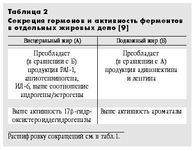 Знание объема отдельных жировых депо и топографии жироотложения также представляет не только академический интерес. Это связано прежде всего с тем, что концентрация некоторых адипокинов и активность ряда ферментов выше в висцеральном жире (имеющем выход на систему портальной вены), а других, напротив, - в подкожном жире, замыкающемся на общую циркуляцию (табл.2). Образование в жировой ткани пептидных и стероидных гормонов позволяет говорить о ней как о своеобразном аналоге яичника, который в равной степени служит источником и половых стероидов, и пептидов (типа ингибина). “Двойное обеспечение функций” (пример - упоминавшееся разнонаправленное влияние лептина и PAI-1, с одной стороны, и адипонектина, с другой, на инсулинорезистентность) также может рассматриваться как важная характеристика гормоноподобных продуктов, секретируемых жировой тканью.