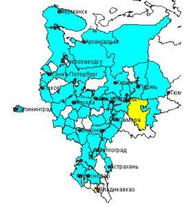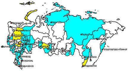 Рис. 8. Заболеваемость гриппа и ОРВИ в РФ на состояние 28.10.2007 г. - нет данных, - относительно стабильные уровни заболеваемости, - рост заболеваемости, - эпидемия, продолжающийся рост заболеваемости, - эпидемия, заболеваемость идет на спад, - снижение заболеваемости (Бугаев В., 2007).
