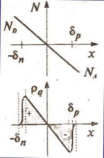 φ(х) – распределение потенциала,  - объёмная плотность электрического заряда, ε – диэлектрическая проницаемость. В самом общем случае определяется суммой всех зарядов, которые существуют в материале, т.е. . Разные знаки связаны с разным зарядом. При комнатной температуре примеси полностью ионизированы, и значения и (концентрации ионизированных примесей) равны и . С концентрацией носителей заряда оказывается сложнее поскольку она меняется на протяжении p-n перехода. В первом приближении можно считать, что в p-n переходе нет носителей заряда (обеднённый слой). Как показывают численные расчёты, это приближение оказывается достаточно точным, поскольку изменение концентрации электронов и дырок на протяжении p-n перехода изменяется как минимум на порядок. И только на границах p-n перехода приближение оказывается не точным, поскольку концентрация – плавная функция и не имеет разрывов. Однако размеры этих приграничных слоёв очень малы, намного меньше реальных размеров p-n перехода. Следовательно, в области p-n перехода объёмная плотность заряда определяется только распределением примеси , которое в общем случае представляет собой произвольную кривую. Однако тогда невозможно решить аналитически уравнение Пуассона. Даже если взять экспоненциальную зависимость концентрации примеси (приближённое описание процесса диффузии), решение оказывается настолько сложным, что теряет всякий смысл. Поэтому резонно разложить кривую распределения примеси в ряд Тейлора и искать приближенное решение. Плавный p-n перехода Первое приближение даёт линейное распределение примеси (рис. 1). Такое приближение достаточно хорошо описывает некоторые диффузионные p-n переходы и переходы коллектор-база в биполярных приборах. P-n переход в этом случае называется плавным. Объёмный заряд линейно зависит от х и определяется  где a –градиент концентрации примеси, т.е. первая производная кривой распределения примеси в точке металлургического контакта. Тогда первое интегрирование даст следующий результат: Здесь - постоянная величина, которая появляется при интегрировании. Для определения этой величины следует ввести граничные условия. Известно, что напряжённость электрического поля определяется как Рис. 1 , следовательно, мы получили распределение напряжённости электрического поля вдоль оси x, взятое с обратным знаком. Если считать, что проводимость полупроводников в объёме намного больше проводимости слоя объёмного заряда, то всё электрическое поле сосредоточено в слое объёмного заряда, а в объёме полупроводников оно равно нулю. Следовательно, для и . Тогда для , для и , . Второе интегрирование позволяет получить распределение потенциала вдоль оси x: