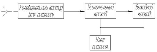 В устройстве можно выделить 4 основных узла: антенна (параллельный колебательный контур), усилительный каскад, выходной каскад и узел питания.