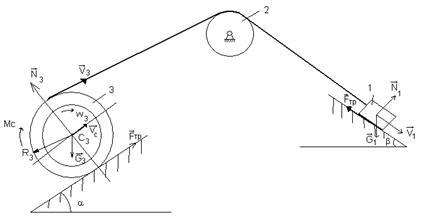 Для определения скорости и ускорения точки М запишем уравнения, связывающие скорость груза V и угловые скорости колес и .