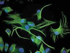 Обнаружить стволовые клетки можно с помощью специальных методов. Дело в том, что в «нативных» стволовых клетках и их производных синтезируются специфические белки, которые выявляются с помощью иммуногистохимической техники. На каждый белок получают антитела, которые метят флюоресцирующим красителем. Такой реагент выявляет белки, присутствующие в стволовых клетках на разных стадиях развития. Так, нейральные стволовые клетки содержат белок нестин (рис.2). Когда они вступают на путь специализации, в них появляется новый белок — виментин. Если клетки развиваются в нейральном направлении, то синтезируются соответствующие маркирующие белки — нейрофиламентные, b3-тубулин, энолаза и др. Когда клетки специализируются как вспомогательные, глиальные, появляются другие маркеры, например глиальный фибриллярный кислый белок, белок S-100 и др.