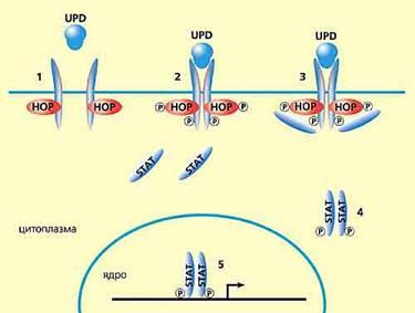Одна из важнейших общебиологических проблем, решить которую помогут стволовые клетки, — генетический механизм поддержания детерминированного состояния в ходе деления клеток и выхода их в дифференцировку. Всерьез ее поставил еще Э.Хадорн в 50-е годы прошлого века, но до сих пор она не решена. Недавно удалось пролить некоторый свет на молекулярно-генетические события при переходе клетки из детерминированного состояния в дифференцировку. Наша соотечественница Наталья Тулина, работающая в США, заметила, что для такого перехода очень важно взаимоотношение стволовых клеток с клетками-«нишами», к которым они «прилежат». Так, в семенниках дрозофилы соматические клетки «хаба», формирующие нишу стволовых клеток, содержат белок UPD, который, в свою очередь, активирует так называемый сигнальный каскад Jak-STAT. Усиленный синтез UPD в клетках апикального района семенников приводит к росту и репродуктивных, и стволовых клеток семенника. Для поддержания обоих типов клеток необходимо участие компонентов Jak-STAT сигнального каскада, киназы НОР и транскрипционного активатора STAT92E. Активацию всего комплекса белков запускает UPD, который клетки-«ниши» передают стволовым клеткам. Разрыв связи между ними обусловливает начало дифференцировки стволовых клеток (рис.4). Насколько универсален этот механизм, предстоит еще выяснить.