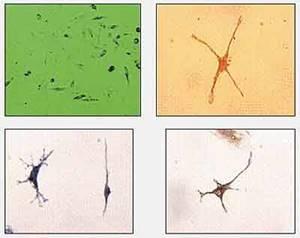 Группа американских ученых под руководством Е.Мизей показала, что стволовые клетки, куда бы их ни имплантировали, способны достигать поврежденного места, в частности мозга, и обеспечивать там восстановительные процессы. Так, после внутривенного введения взрослым мышам стромальных стволовых клеток во многих областях мозга (включая неокортекс, гиппокамп, таламус, ствол мозга и мозжечок) были обнаружены различные нейральные производные. Впрочем, литературные данные по этой проблеме весьма противоречивы. Однако если к культуре стромальных стволовых клеток добавить ретиноевую кислоту, в них обнаруживаются нейральные маркеры (рис.5). Такие клеточные культуры харьковские хирурги небезуспешно применяли для лечения болезни Паркинсона, вводя их в область полосатого тела (рис.6).