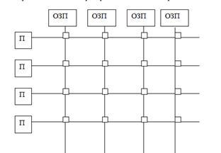 На вузлах сітки провідників ставиться комутатор, який відкриває або забороняє процесору доступ до даного блоку пам’яті. В системі, в якій є n процесорів та n блоків пам’яті потрібно комутаторів, що при значних n є дуже великим числом.