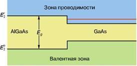 Найпростіша квантова структура, в якій рух електрона обмежена в одному напрямку, - це тонка плівка або просто досить тонкий шар напівпровідника. Саме на тонких плівках металу вісмуту і напівпровідника InSb вперше спостерігалися ефекти розмірного квантування [2]. В даний час квантові структури виготовляють інакше. Розглянемо структуру енергетичного спектру напівпровідників. Цей спектр складається з дозволених і заборонених енергетичних зон, які сформовані з дискретних рівнів атомів, що утворюють кристал. Найвища енергетична зона називається зоною провідності. Нижче зони провідності розташована валентна зона, а між ними лежить заборонена зона енергій. В одних напівпровідників заборонені зони широкі, а в інших більш вузькі. Що станеться, якщо привести в контакт два напівпровідника з різними забороненими зонами (межа таких напівпровідників називається гетероструктурою). На рис. 1 зображена кордон вузькозонних і широкозонного напівпровідників. Для електронів, що рухаються в вузькозонних напівпровідників і мають енергію менше , Кордон буде грати роль потенційного бар'єру. Два гетеропереходи обмежують рух електрона з двох сторін і як би утворюють потенційну яму.