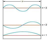 У квантовій механіці електрон не бігає в обмеженій області, як класична частинка. Якщо він замкнаний в атомі, молекулі або будь-якої потенційної ямі, то хвильова функція представляє собою стоячу хвилю. Якщо мова йде про прямокутну потенційну яму, яка зображена на рис. 2, то за своєю формою хвиля буде такою ж, як і у випадку натягнутої струни, але дискретним в цьому випадку буде не спектр частот, а спектр енергій. Стоячі хвилі, що описують електронні стани в ямі, - це синусоїди, які обертаються в точках x = 0 і x = a в нуль.