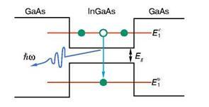 Для того щоб квантову яму перетворити на лазер, потрібно її під'єднати до двох контактів, через які електрони можуть безперервно надходити в робочу область. Нехай через один контакт електрони надходять у зону провідності. Далі, роблячи стрибки із зони провідності у валентну зону, вони будуть випромінювати кванти, тобто порції електромагнітного випромінювання (рис. 3). Потім через валентну зону носії струму повинні йти на інший контакт.