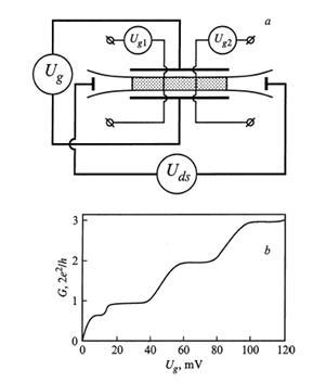 - спіновий і частковий фактори відповідно. Зростання напруги на затворі призводить до збільшення ширини квантової дроту, тим самим стимулюючи заповнення більшої кількості підзон розмірного квантування. При цьому залежність G(Vg