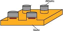 На рис. 5 показані квантові точки, створені на межі розділу арсеніду галію і арсеніду алюмінію-галію. У процесі росту в напівпровідник AlGaAs були введені додаткові домішкові атоми. Електрони з цих атомів йдуть в напівпровідник GaAs, тобто в область з меншою енергією. Але вони не можуть піти дуже далеко, тому що притягуються до покинутих ними атомам домішки, які отримали позитивний заряд. Практично всі електрони зосереджуються у самої гетерограниці з боку GaAs і утворюють двовимірний газ. Процес формування квантових точок починається з нанесення на поверхню AlGaAs ряду масок, кожна з яких має форму кола. Після цього проводиться глибоке травлення, при якому видаляється весь шар AlGaAs і частково шар GaAs (це видно на рис. 5).