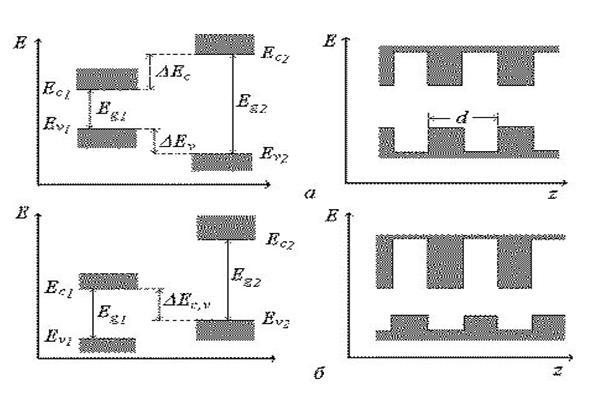 По розташуванню енергетичних зон напівпровідників композиційні надгратки поділяються на кілька типів. Напівпровідникова надгратка GаАs - АlxGa1-xАs відноситься до надграток I типу у яких мінімум зони провідності Еc1 і максимум валентної зони Еv1 одного напівпровідника по енергії розташовані всередині енергетичної щілини іншого (рис. 6, а). У надгратках цього типу виникає періодична система квантових ям для носіїв струму в першому напівпровіднику, які відокремлені один від одного потенційними бар'єрами, створюваними в другому напівпровіднику. Глибина квантових ям для електронів ΔЕС визначається різницею між мінімумами зон провідності двох напівпровідників, а глибина квантових ям для дірок - різницею між максимумами валентної зони ΔЕv (рис. 6, а).