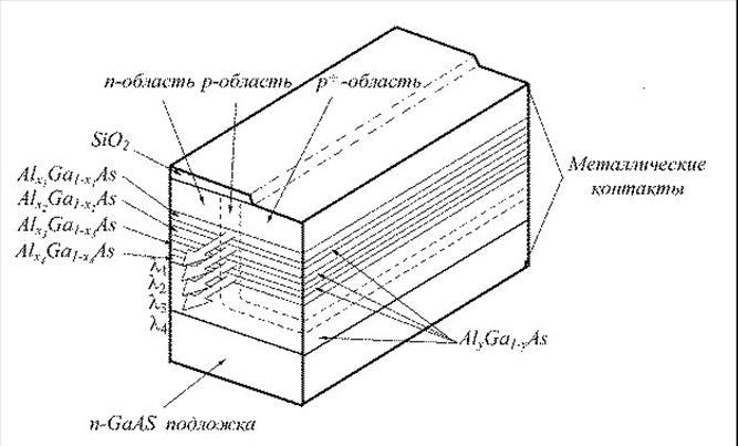 В якості прикладу на рис. 10 показано схематичне зображення структури многоволновой лазера [6]. У структурі є чотири активних шари AlxGa1-xAs різного складу (x = x1, x2, x3, x4), завдяки яким лазер одночасно працює на чотирьох довжинах хвиль 1, 2, 3 та 4. Активні шари відокремлені один від одного проміжними шарами AlyGa1-yAs (y > x1, x2, x3, x4). Для створення pn-переходів у структурі проводилася локальна дифузія Zn.