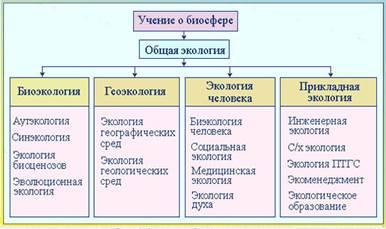 исследования экологии являются экосистемы. Самой крупной в иерархии экосистем является биосфера. Учение о биосфере - это обширная область знания о функционировании и развитии биосферы, включающая в себя целый ряд научных направлений естественнонаучного и общественного профиля. Учение о биосфере включает в себя общую экологию, которая состоит из четырех основных разделов: биоэкологии, геоэкологии, экологии человека и прикладной экологии.
