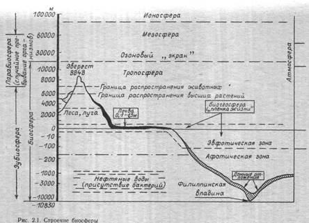 Нижняя граница биосферы опускается на 2-3 км от поверхности суши и на 1-2 км ниже дна океана. Верхней границей биосферы служит защитный озоновый слой.