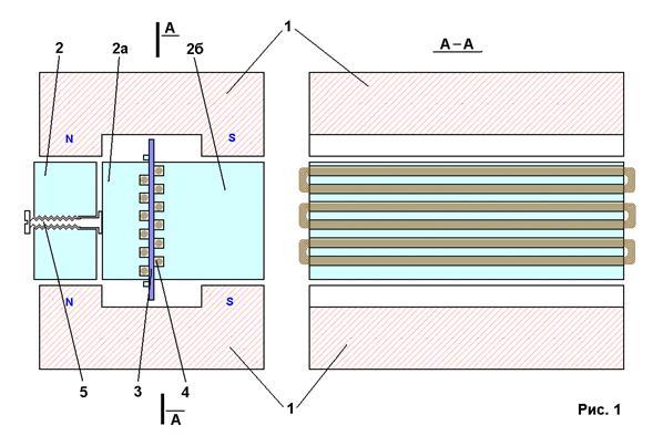 Путь по которому замыкается магнитный поток в замкнутой цепи создан из ферромагнитного материала 2, 2а, 2б и двух немагнитных зазоров.