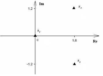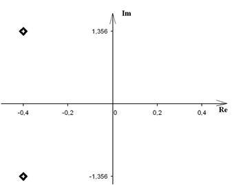 Распределение корней на комплексной плоскости показано на рис. 2. По рисунку видно, что корни лежат в правой полуплоскости, следовательно, объект неустойчив.