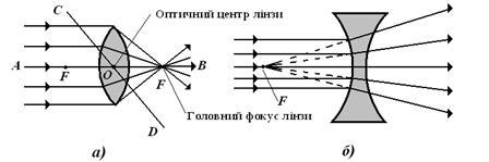 промінь, паралельний головній оптичній осі в збираючій лінзі, проходить через фокус, а в розсіюючій лінзі його напрямок буде таким, що виходить з фокусу;