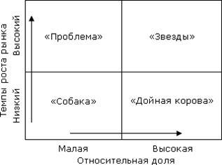 На горизонтальной оси матрицы - диапазон изменений роста рыночной доли анализируемого предприятия. Полученное поле матрицы делится на четыре квадрата .
