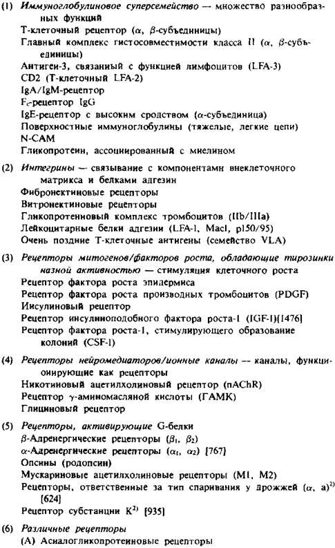 Сравнение аминокислотной последовательности рецепторов показывает, что многие из них могут быть сгруппированы в суперсемейства структурно родственных, но функционально различающихся белков. Например, многие рецепторы, участвующие в межклеточной адгезии, принадлежат к суперсемейству иммуноглобулинов IgG. Интегрины составляют другое суперсемейство, включающее в себя множество рецепторов для внеклеточных компонентов матрикса.