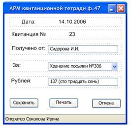 АРМ квитанционной тетради ф. 47. Первая форма имеет следующий вид.